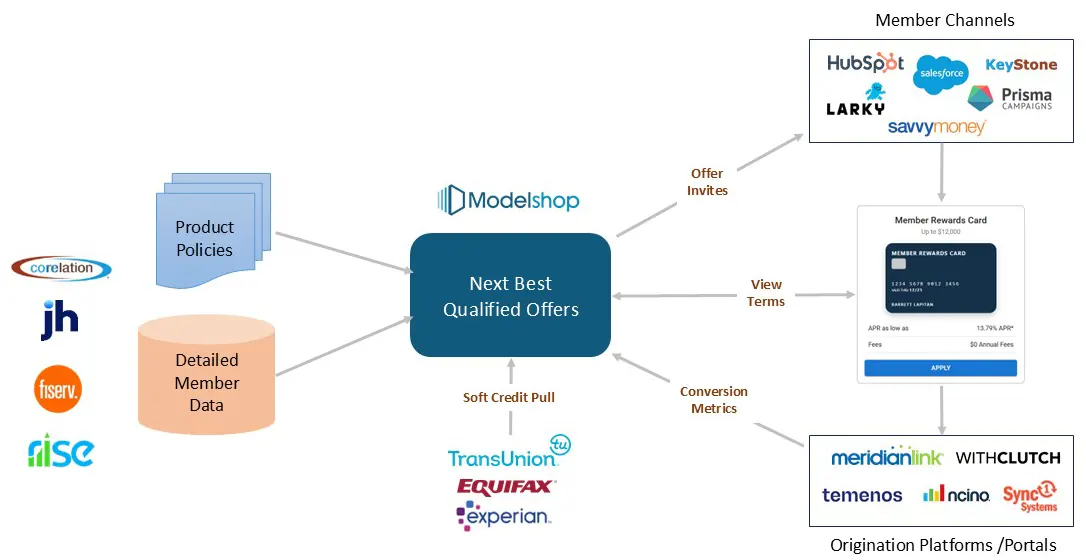 NBQO uses your credit union’s existing member data—such as account history and transactions — to identify the most relevant credit products for each member. Before any offer is shown, the system checks the member’s likelihood of approval using internal criteria.